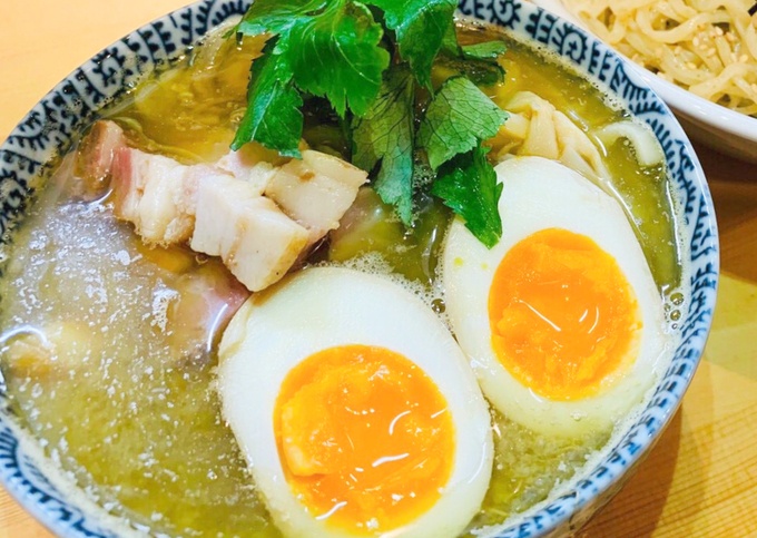 通常の「醤油つけそば」には、ネギとミツバ、「特製」には味玉、チャーシュー、メンマがトッピングされます。