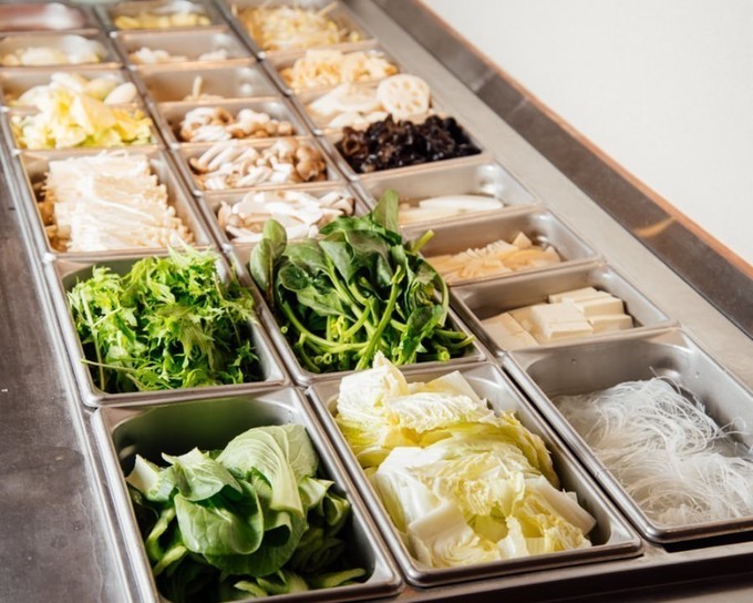 白菜、チンゲンサイなど30種類以上の野菜と、しめじやエリンギなどのきのこ類、豆腐も食べ放題です。