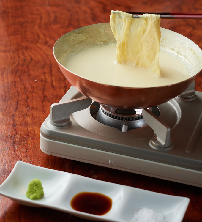 コースメニューの「卓上引き上げ湯葉」は、目の前で出来立ての湯葉を味わえます。