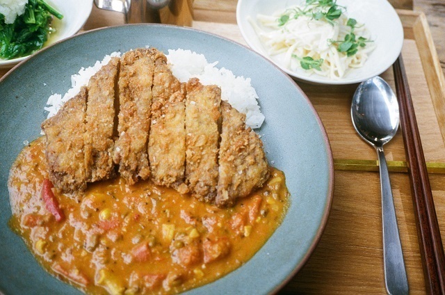 ランチにぴったりな「カツカレー ナスのお浸し 根セロリラペ」。カレーは繊細なスパイス使いが光る。カツにはお好みで自家製ソースをかけても