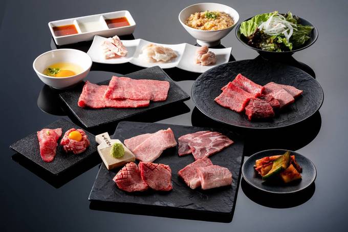 ■内容:「前菜」「塩サラダ」「キムチ3種」「和牛ユッケ」「牛トロにぎり」「塩焼き(4種)」「タレ焼き(5種)」「ホルモン焼き(3種)」「名物玉子かけご飯or冷麺」「デザート」