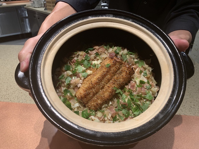 ▲牛テールの出汁で炊いた天然の鱧の炊き込みご飯