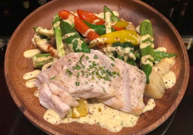 自家製のマスタードソースをかけてオーブンで焼き上げたお肉と彩り豊かな野菜は、抜群の芳ばしさです。