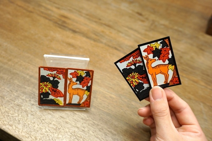 ちなみに、渡された10枚の中からこの2枚「菊に盃」と「鹿に紅葉」の絵柄が揃った場合は、お酒が1杯無料になります。
