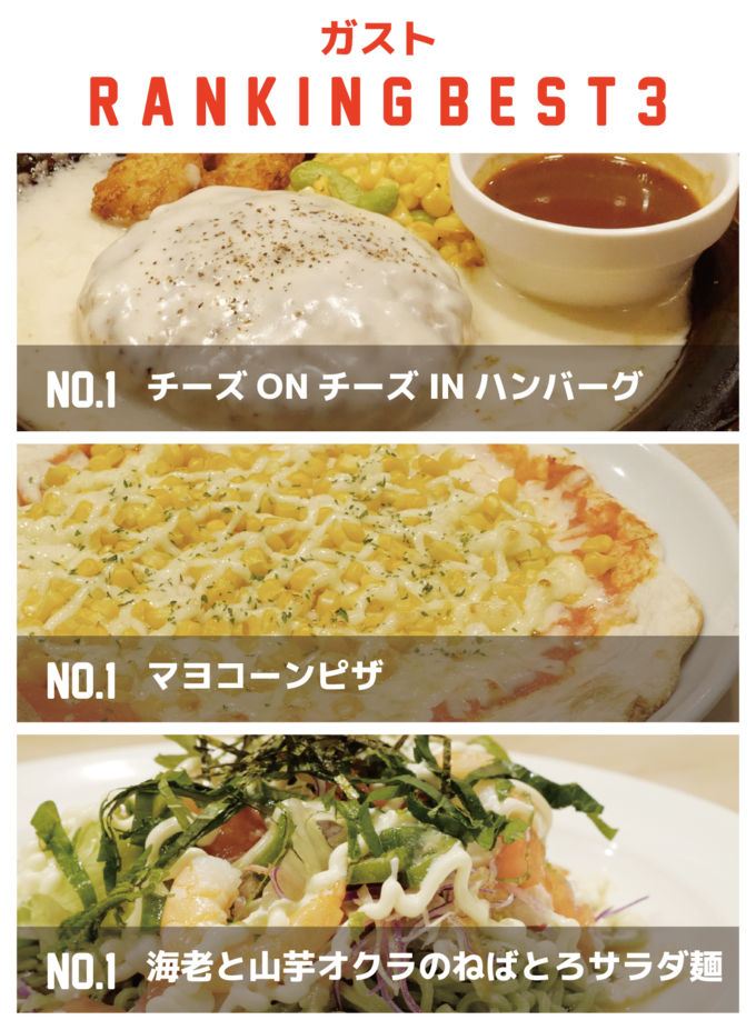 favy編集部の独断と偏見で決めた『ガスト』のおすすめランキングBEST3は、1位「チーズONチーズINハンバーグ」2位「マヨコーンピザ」3位「海老と山芋オクラのねばとろサラダ麺」となりました。