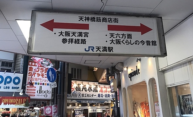 頭上に「天神橋筋商店街」の看板が現れたら、「大阪天満宮・参拝経路」の方向に左折。