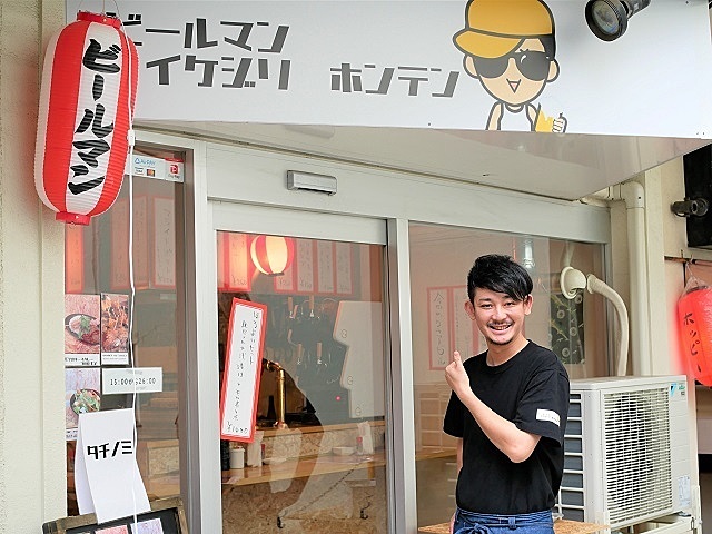 池尻大橋駅から徒歩1分あるマンションの1階部分には3軒の飲食店が並ぶ。その真ん中にて営業するのが、「ビールマン イケジリホンテン」。ポップなイラストに赤提灯が下がるファサードが存在感を放つネオ酒場だ。
