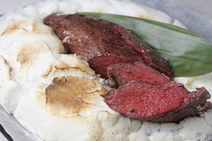 塩釜焼きは、その名から「焼き物」というイメージがありますが、実は蒸し料理。今回はほどよくサシが入ったA4黒毛和牛のなかでも、ジューシーな部位のみを贅沢に使用しました。