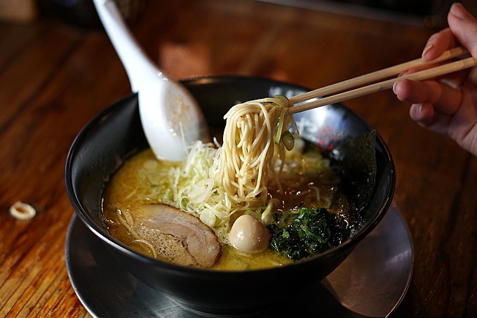 具材はウズラの卵やほうれん草など「家系」らしさを感じる食材。