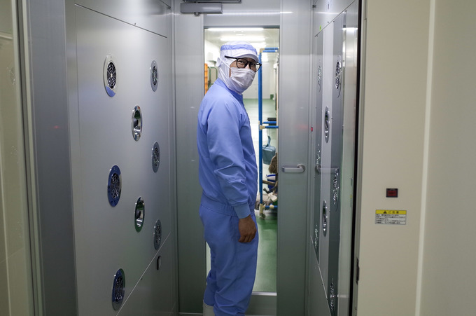 まずは完全装備で念入りに手洗い消毒した上、エアシャワーで汚染物の侵入をシャットアウトします。