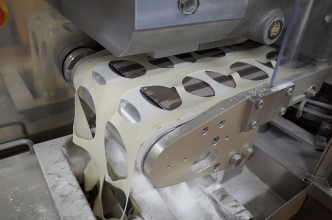 シート状の皮が次々と丸い形にくり抜かれていきます。