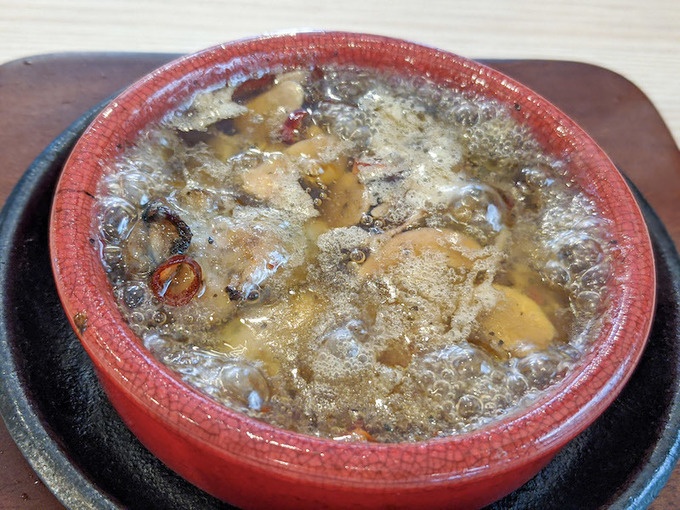 グツグツと煮えたった状態で提供される「牡蠣のアヒージョ」。