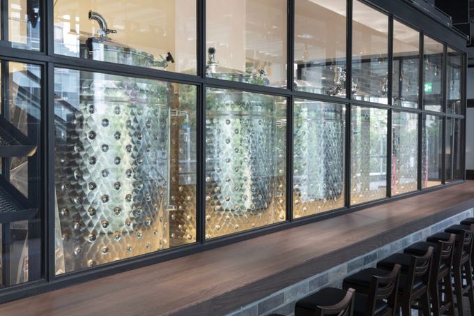 醸造所に並ぶ醸造タンクをガラス越しに眺めながらワインや食事を楽しむことができます。