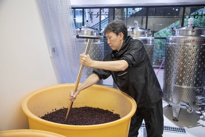 併設のワイナリーでは、ぶどうの圧搾から醸造、完成までを手作業でおこなっています。