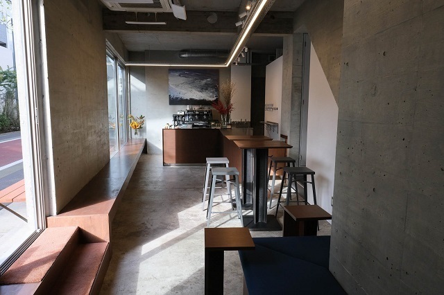 シンプルでモダンな印象の店内。ベンチシートやスツール席などを配置。ちょっとした集まりや待ち合わせなど気軽に使える。フリーWi-Fiや電源も完備し、作業するお客も