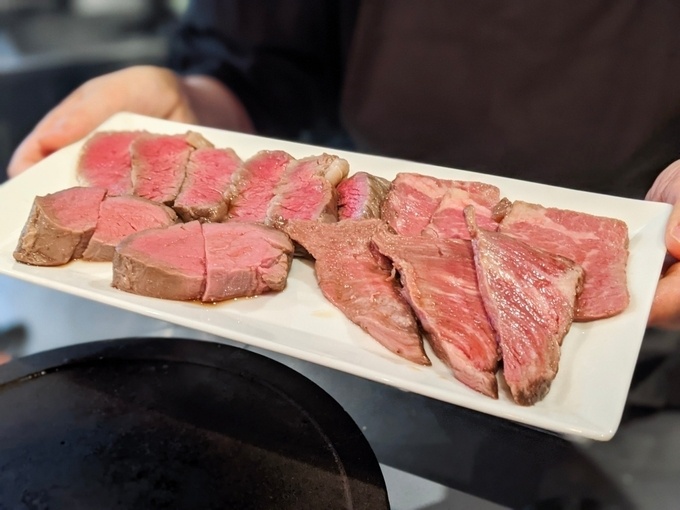 きめ細やかなサシがしっかり入った「本日の和牛」と、ヤキニクストアの看板「赤身カルビ」の2種類を楽しめます。