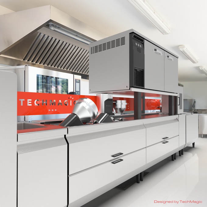 約4年の開発期間により完成した「パスタ自動調理ロボット」が厨房に設置されており、スパゲッティを茹で、味付けや調理して完成するまで、最短45秒で提供できるとのこと。