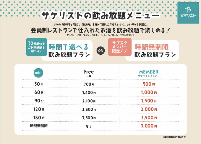月額550円で「サケリストメンバー」になれば、30分700円の飲み放題が200円引きの500円(各税込)に。1時間以上飲むなら、「サケリストメンバー」にならないともったいない!