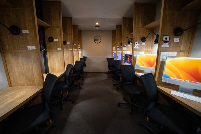 静かな空間で集中的に作業できる「ワークスペース」には、以前同様5台のPC(Windows3台、Mac2台)が用意されています。