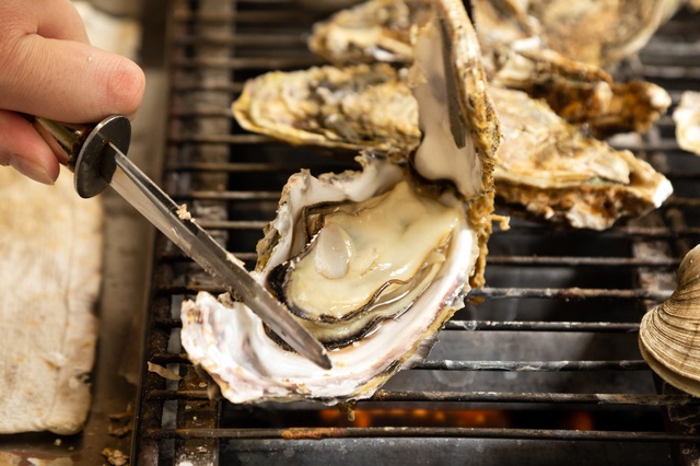 浜焼きで焼き上げた大きな牡蠣は、絶妙な焦げ感が食欲をそそるポイントです。