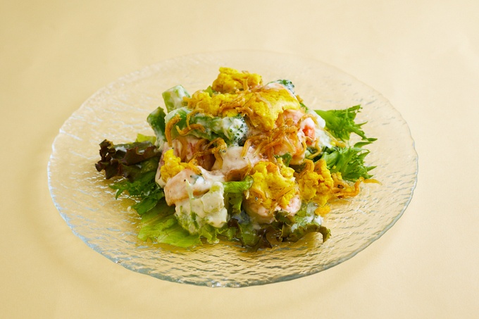カリカリの揚げじゃこと焼いて旨味を引き出した海老のサラダに、クリーミーなソースをあわせたサラダ。