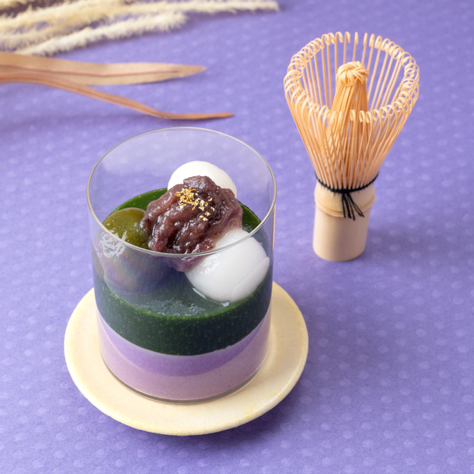 濃厚な抹茶ジュレと紫いものムースの2層が美しいコントラストを描き、上にはもちもちの「白玉」と「小豆」、そして金粉があしらわれ、満月のような輝きを放ちます。