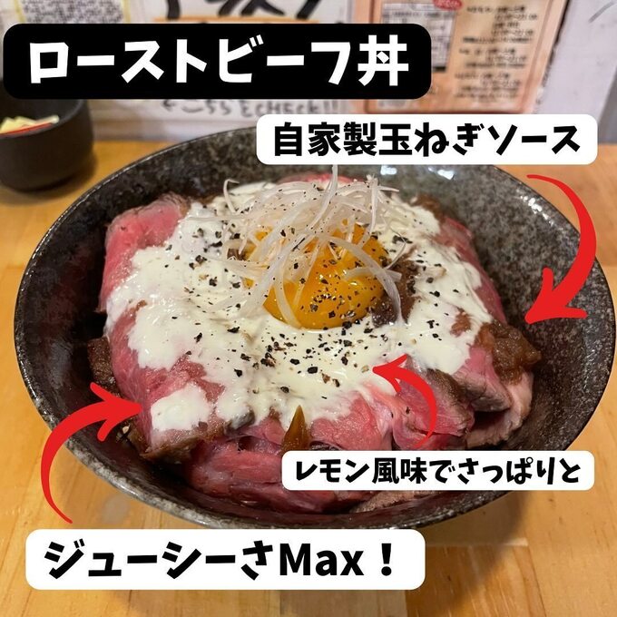 『にく美』の「ローストビーフ丼」は、自家製甘め玉ねぎソースとレモン風味のヨーグルトソースで仕上げられたひと品。