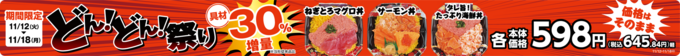 「サーモン丼」「ねぎとろマグロ丼」「タレ旨!たっぷり海鮮丼」の3種の海鮮丼の具材を、なんと30%も増量して販売しているのです。