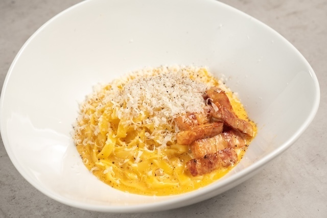 生クリームは使わず、卵、ペコリーノ・ロマーノ(チーズ)、グアンチャーレ(豚の頬肉を塩漬けにして熟成させたもの)、ブラックペッパーだけで仕上げた看板メニューです。