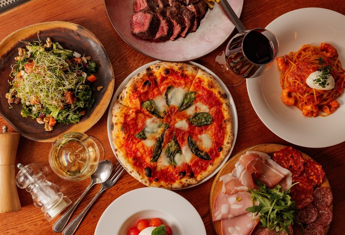 平日と休日で異なるランチメニューを提供し、季節の食材を活かしたピザや前菜、ドリンクがセットになったコースを楽しめます。