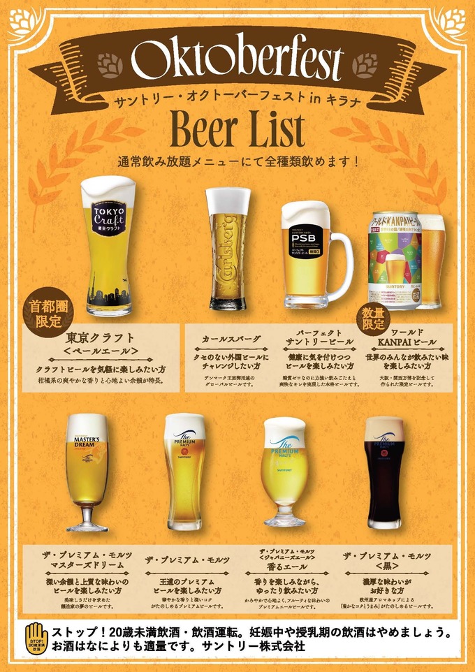 10月限定の「サントリー・オクトーバーフェストinキラナ」では、「東京クラフト」をはじめ、「ザ・プレミアム・モルツ」や「カールスバーグ」など、サントリーの人気ビール全8種が飲み放題プランに追加されます!