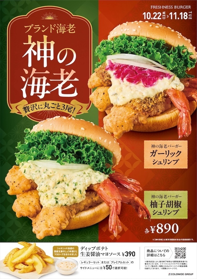 全国の『フレッシュネスバーガー』では、ブランド海老「神の海老」を使用した「神の海老バーガー 柚子胡椒シュリンプ」と「神の海老バーガー ガーリックシュリンプ」を販売します。
