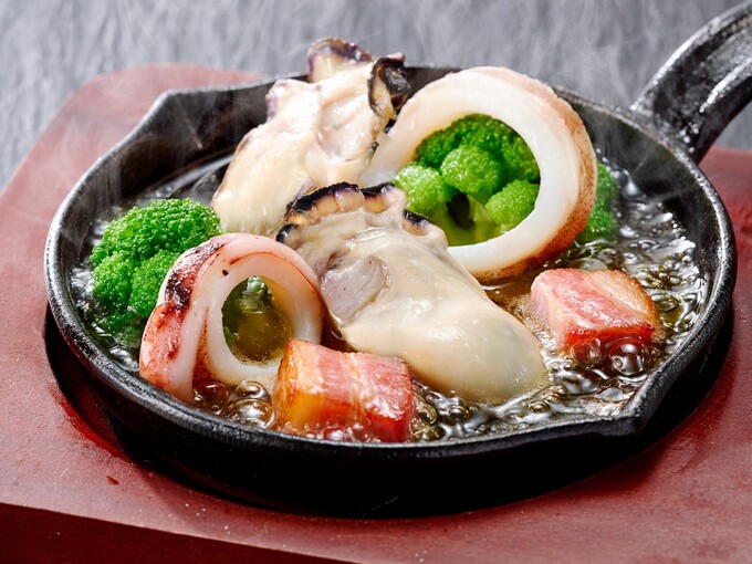 「カキとイカのオイル焼」は、大粒の牡蠣をイカ、ベーコン、ブロッコリーとともにニンニクの効いたオリーブオイルで煮込んだひと品です。