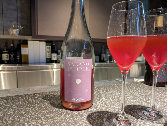 期待の高まった1杯目に登場したのは、高級品種の黒ブドウ・ナガノパープルを使用した「ナガノパープルスパークリング」。