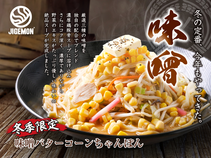 「味噌バターコーンちゃんぽん」は、厳選した三種類の味噌を独自の配合でブレンドし、『じげもんちゃんぽん』自慢の濃厚鶏豚骨スープと合わせた冬の人気メニュー。
