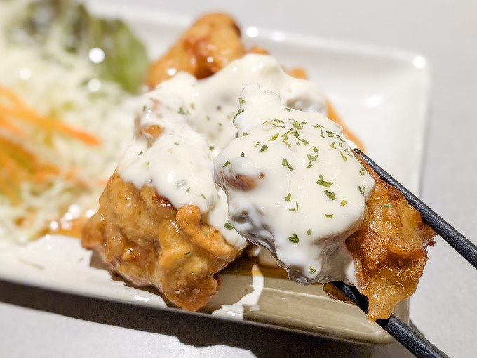 こちらも『肉バル 炎や』の「タルタルチキン南蛮」。1個がとにかく大きく、持った瞬間ずっしりとした重みを感じます。