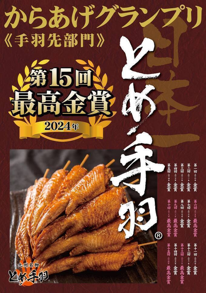 「とめ手羽」は、九州名物の手羽先唐揚げ。日本唐揚協会主催の「唐揚げグランプリ」で15年連続金賞、過去には最高金賞も獲得した実力を持つ逸品です。