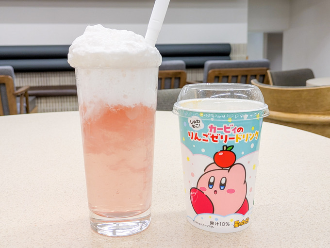 こちらはカービィらしいピンク色がかわいいゼリードリンク。りんごゼリーに別添えの「しゅわもこの素」を混ぜると、泡がもこもこと湧き上がってきます。