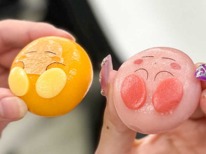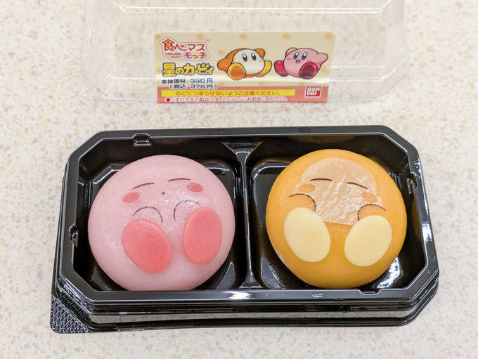 カービィとワドルディが和菓子になった「食べマスモッチ」。カービィはカスタード味、ワドルディはキャラメル味の餡が入っています。