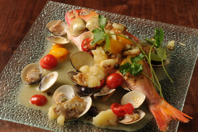 「館山宝石金目鯛と、生簀直送活貝の豪快アクアパッツァ」