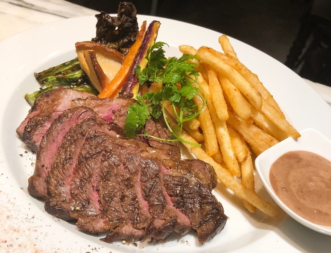 「ブラックアンガス牛ステーキ」は、ストリップロイン(サーロイン)をミディアムレアで用意。