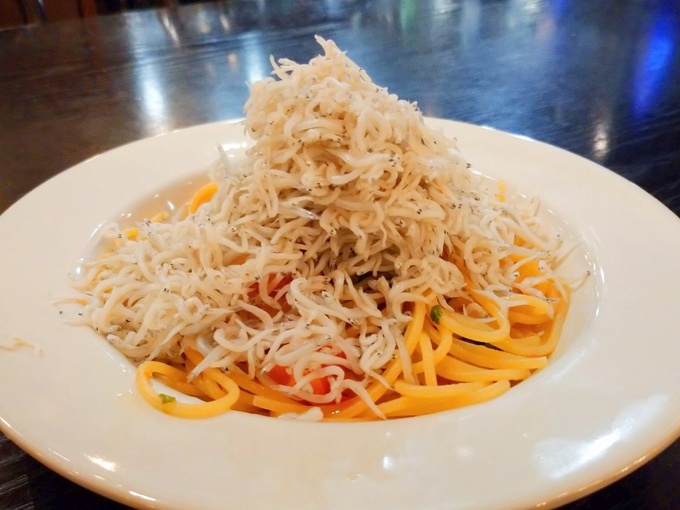 〆のパスタは人気メニュー「どっさりシラスのペペロンチーノ」