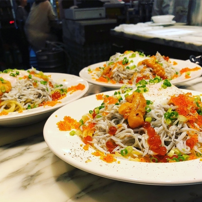 「痛風パスタ」は、「どっさりシラスのペペロンチーノ」をベースにウニ、いくら、温泉卵、とびっこをさらにトッピング。