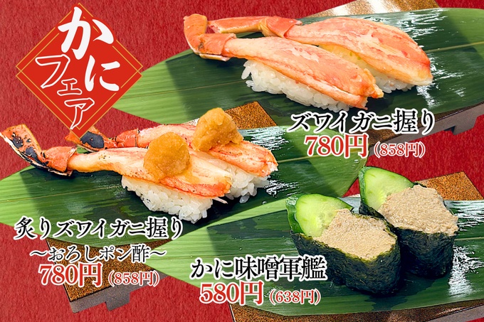 「炙りズワイガニ握り~おろしポン酢~(2貫)」858円(税込)