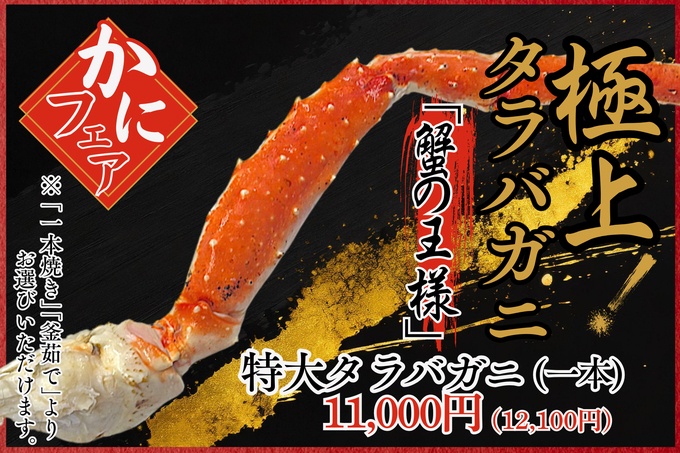 本フェアでは、特大タラバガニを一本まるごと堪能できる豪華なひと品や、ズワイガニを使用した握り寿司、しゃぶしゃぶなどの多彩なメニューが登場します。