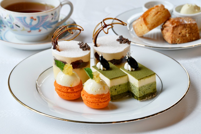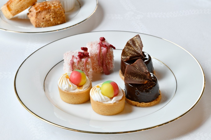 スイーツには、ホテル伝統のプリンに飴細工をトッピングした「クラシックプリン」や、玉露の香りと旨味が広がる「ガトー・オ・テヴェール」、雪化粧のようなココナッツをまとった「苺のラミントン」、鏡餅に見立てた「オレンジと紅茶のマカロン」など、見た目にも可愛らしいバリエーション豊かな品々が並びます。