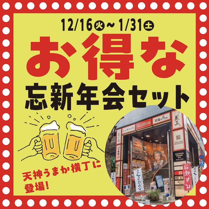 福岡天神駅から徒歩2分、西鉄今泉ビル2階にある『天神うまか横丁』に、年末年始の飲み会にぴったりな「忘新年会セット」が新登場!