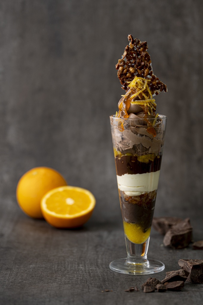 「パフェ オランジュショコラ」は、自家製ガナッシュに北海道産マスカルポーネ、チョコレートプリン、オレンジソースを重ねたひと品。