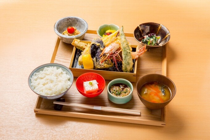 店頭で天ぷらを揚げるライブ感を演出しながら、店内では小鉢を選べる「一汁三菜」スタイルの和定食を楽しめます。
