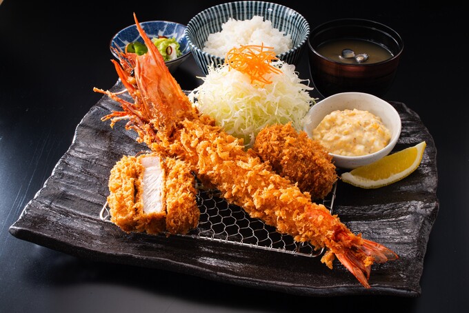 「ロースかつと皇帝の海老定食」は、皇帝の海老1尾に加え、ロースかつ50g、メンチカツ60gがセットになっています。